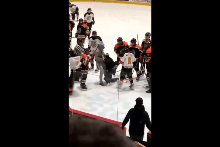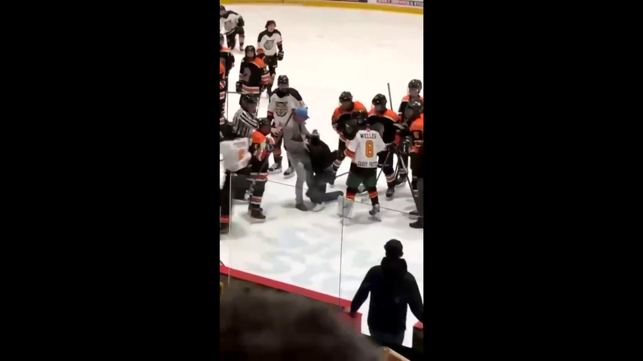 Bench-clearing minor hockey fight, appearing to involve coaches, caught on video
